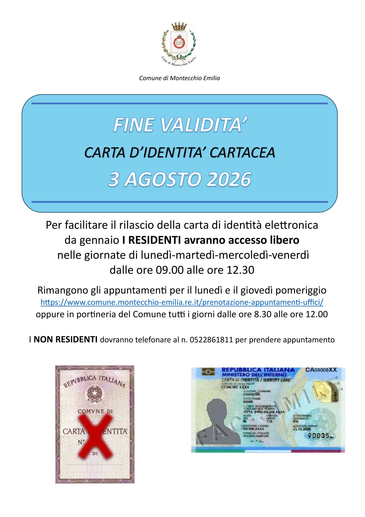 Per il rinnovo delle carte di identità da gennaio i RESIDENTI hanno accesso libero nelle giornate di lunedì, martedì, mercoledì e venerdì dalle ore 9.00 alle ore 12.30.